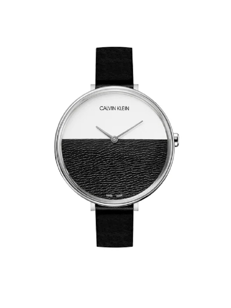 - Orologio Calvin Klein da donna collezione ‘Rise’ con cinturino in pelle nera, cassa in acciaio 38 mm, quadrante nero e bianco. Movimento al quarzo Swiss made. Water resistent