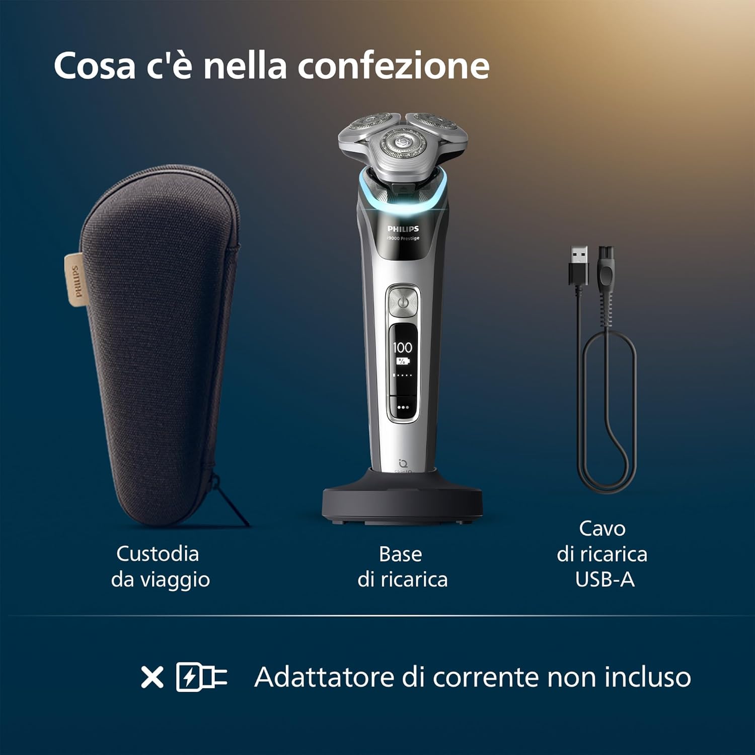 - Il set comprende: 1x rasoio i9000 Prestige, 1x supporto di ricarica, 1x custodia da viaggio, 1x spazzola per la pulizia, 1x cavo USB-A; Adattatore di alimentazione non incluso